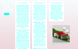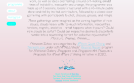 The contributors platformed in Monzoom Zchool were the emerging Singapore-based artists: Aki Hassan, Taufiq Rahman, radioriotgrrrl (Nadirah Khalid & Mengju Lin), as well as artist collectives Pure Ever and desigirl69 (Chand Chandramohan & Divaagar), and the audience consisted of members from local arts universities, communities and institutions as well as international practitioners from Australia, Austria, Denmark, Belgium, Germany, Spain, Sweden, and the UK.